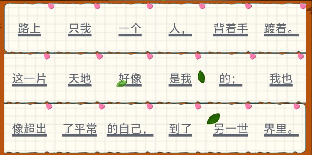 路上只我一个人,背着手踱着。这一片天地好像是我的;我也像超出了平常的自己,到了另一世界里。