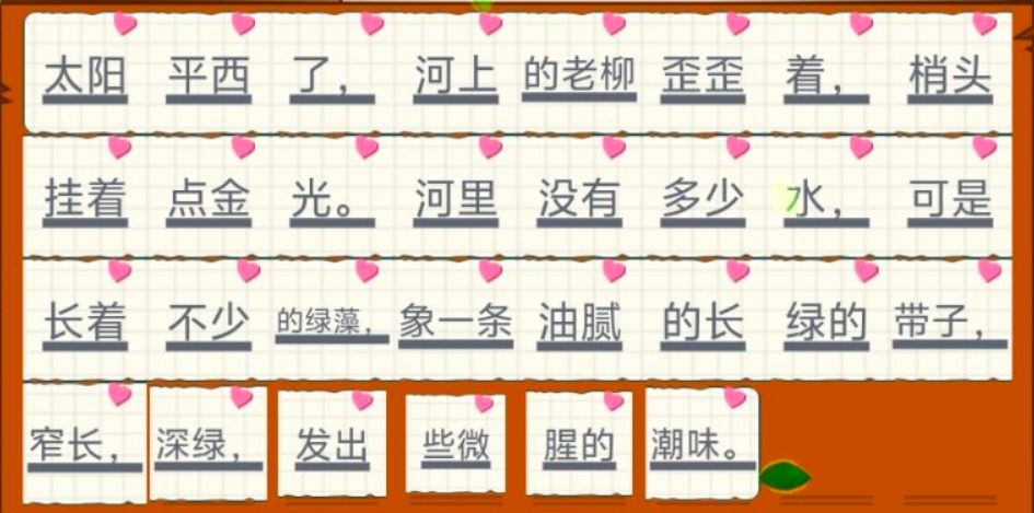 太阳平西了,河上的老柳歪歪着,梢头挂着点金光。河里没有多少水,可是长着不少的绿藻,象一条油腻的长绿的带子,窄长,深绿,发出些微腥的潮味。