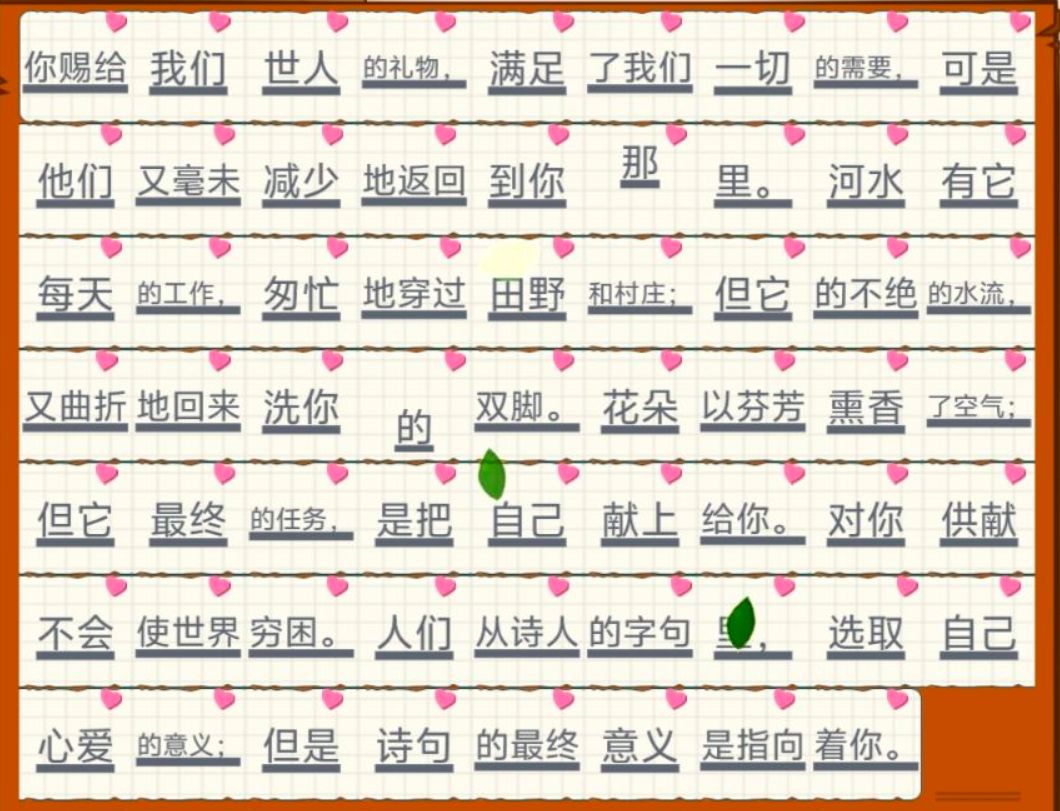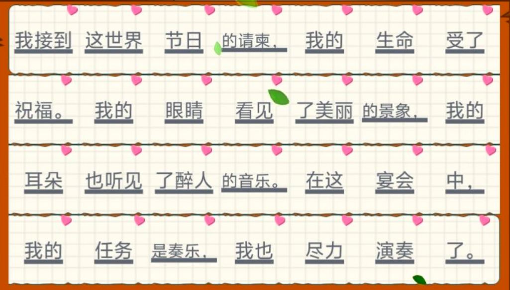 我接到这世界节日的请柬,我的生命受了祝福。我的眼睛看见了美丽的景象,我的耳朵也听见了醉人的音乐。在这宴会中,我的任务是奏乐,我也尽力演奏了。