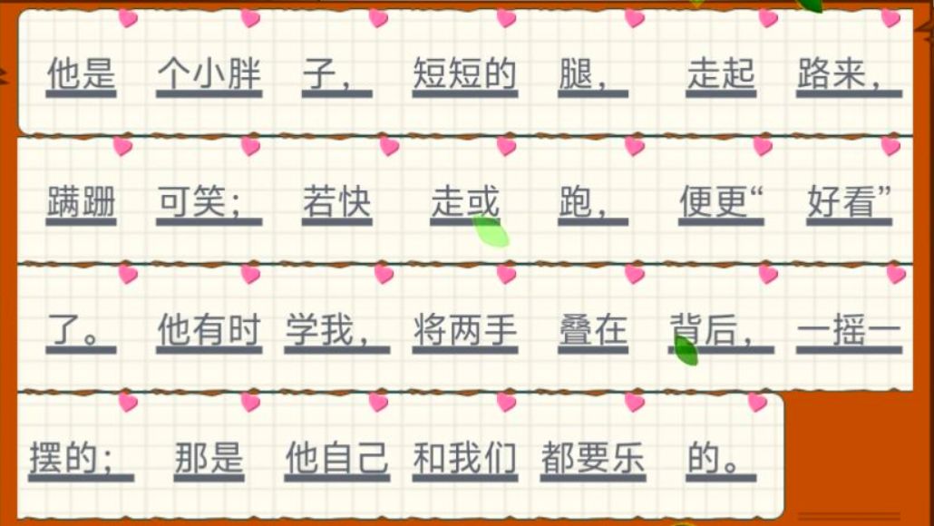 他是个小胖子,短短的腿,走起路来,蹒跚可笑;若快走或跑,便更“好看”了。他有时学我,将两手叠在背后,一摇一摆的;那是他自己和我们都要乐的。