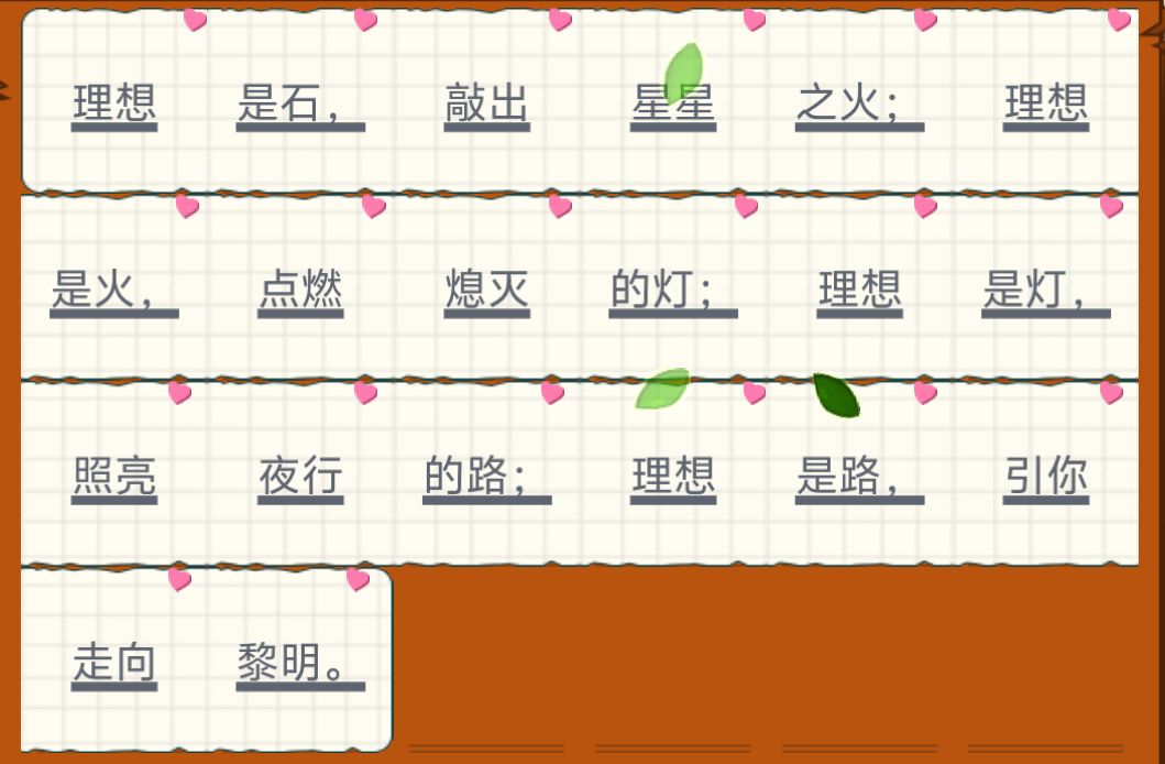 理想是石,敲出星星之火;理想是火,点燃熄灭的灯;理想是灯,照亮夜行的路;理想是路,引你走向黎明。