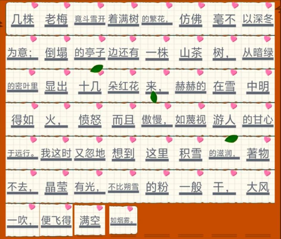深冬为意;倒塌的亭子边还有一株山茶树,从暗绿的密叶里显出十几朵红花来,赫赫的在雪中明得如火,愤怒而且傲慢,如蔑视游人的甘心于远行。我这时又忽地想到这里积雪的滋润,著物不去,晶莹有光,不比朔雪的粉一般干,大风一吹,便飞得满空如烟雾。