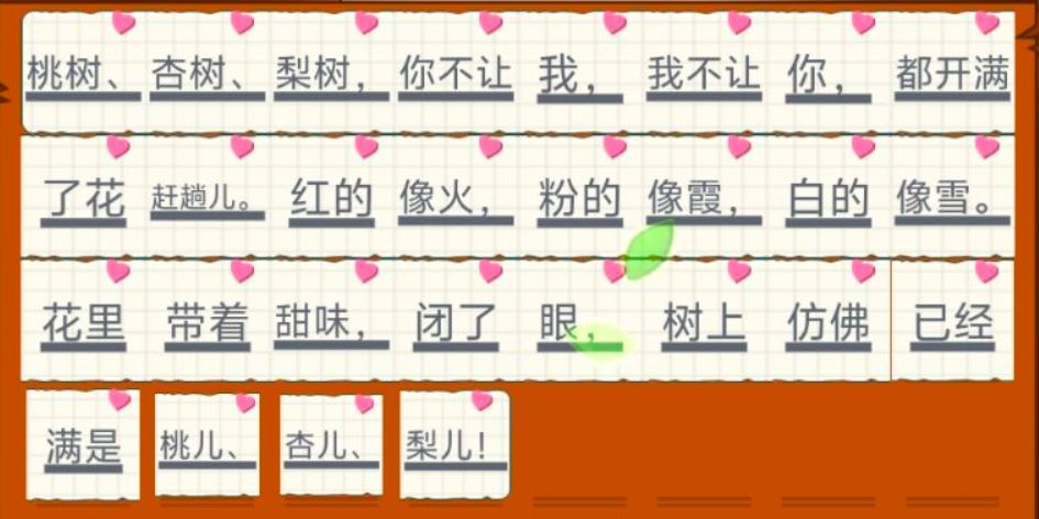 桃树、杏树、梨树,你不让我,我不让你,都开满了花赶趟儿。红的像火,粉的像霞,白的像雪。花里带着甜味,闭了眼,树上仿佛已经满是桃儿、杏儿、梨儿!