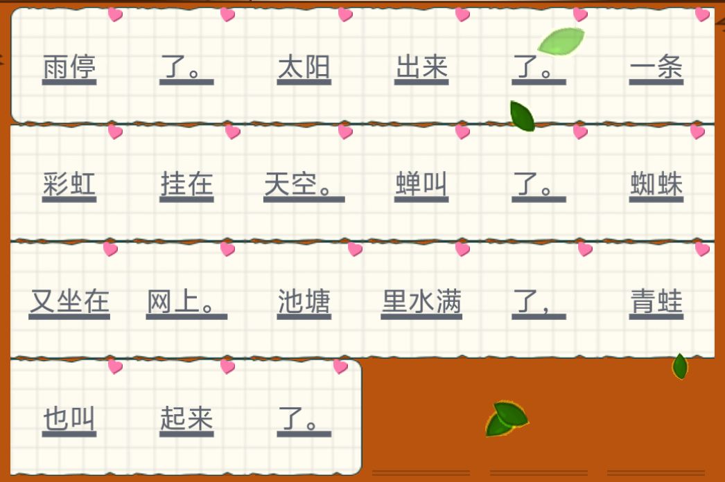 雨停了。太阳出来了。一条彩虹挂在天空。蝉叫了。蜘蛛又坐在网上。池塘里水满了,青蛙也叫起来了。