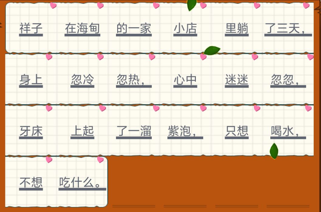 祥子在海甸的一家小店里躺了三天,身上忽冷忽热,心中迷迷忽忽,牙床上起了一溜紫泡,只想喝水,不想吃什么。