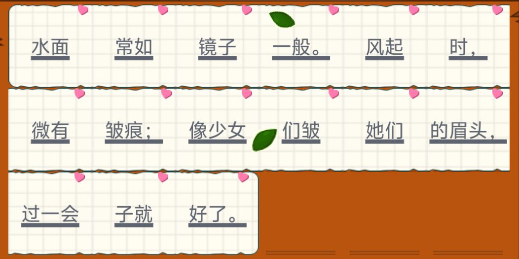 水面常如镜子一般。风起时,微有皱痕;像少女们皱她们的眉头,过一会子就好了。