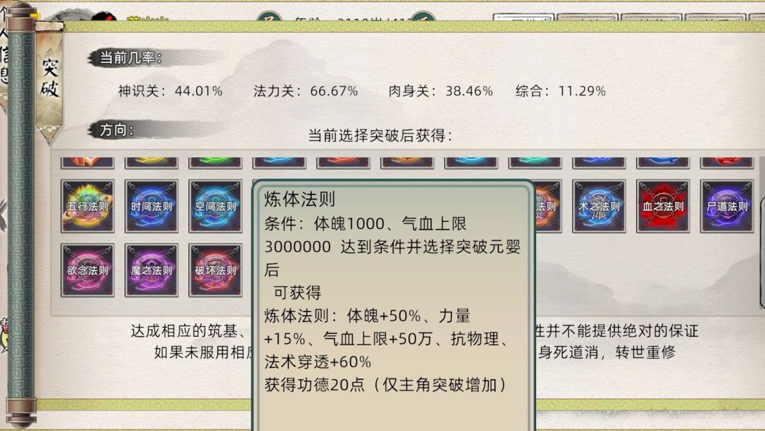 突破化神的时候记得学三本炼体功法,推荐四象+玄龟+任意五级+75体魄和50%气血的功法。以满足炼体法则要求,最好准备中品以上化神丹,有可能需要叠无漏。