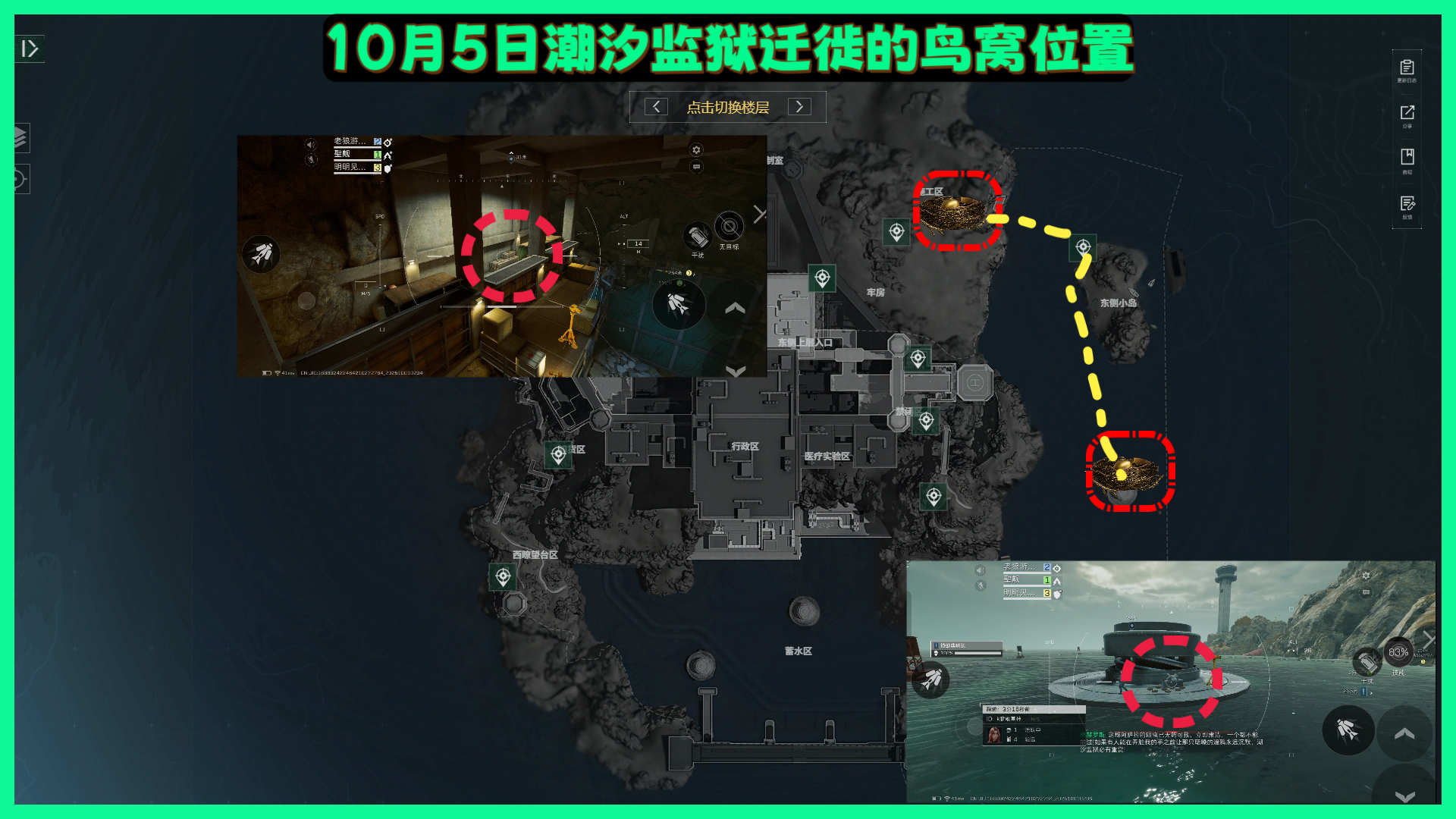 潮汐监狱一共有2个点位,依然全部都在室外,图片从左到右位置依次在:丢包撤,绳索上去最右前方的水泥砌砖堆周围即可看到,这个位置链接室内外和地图最右边圆平台,绳索直接过来即可看到,具体位置参考图片即可~