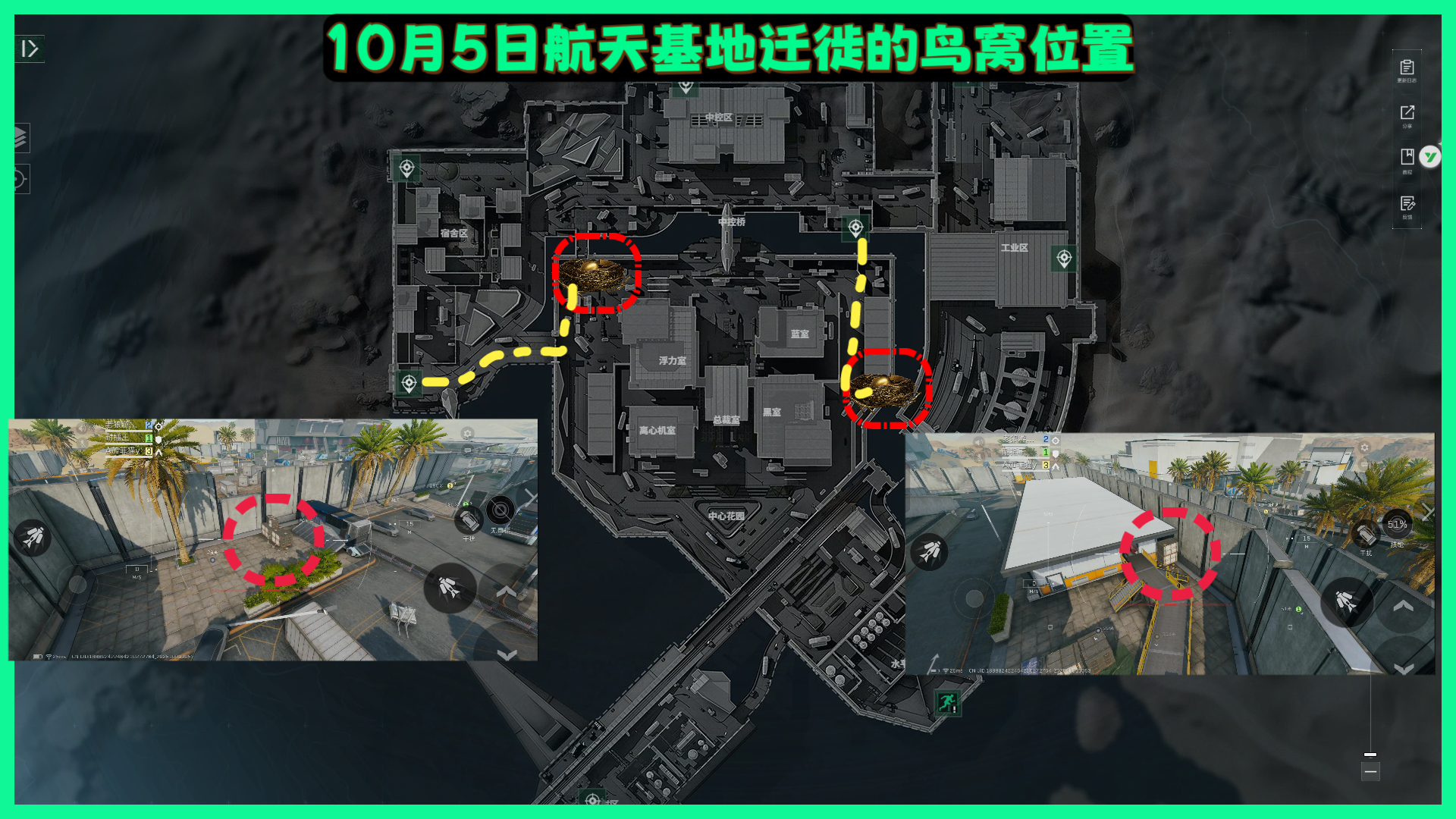 航天基地一共有2个点位,图片从左到右位置依次在:一号员工通道南边门口货箱上面和黑室东侧最外面铁桥和平房交界处货箱周围。需要注意的是:这两个鸟窝的位置1号位都是需要刷卡才能最快到达,具体位置参考图片即可~