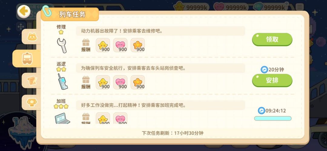 :可以给乘客安排列车任务(巡逻、修理、加班、打扫、站岗……等)可获取收益!