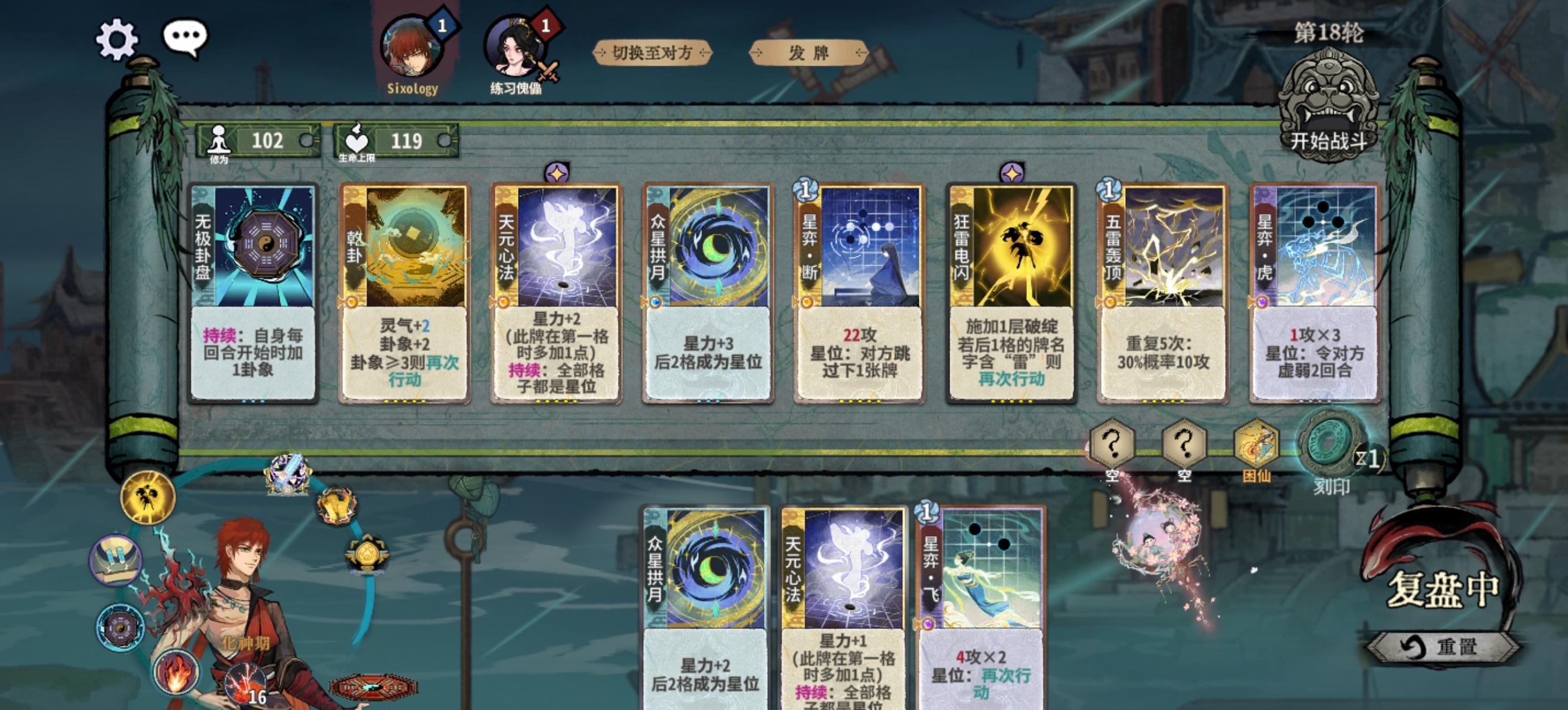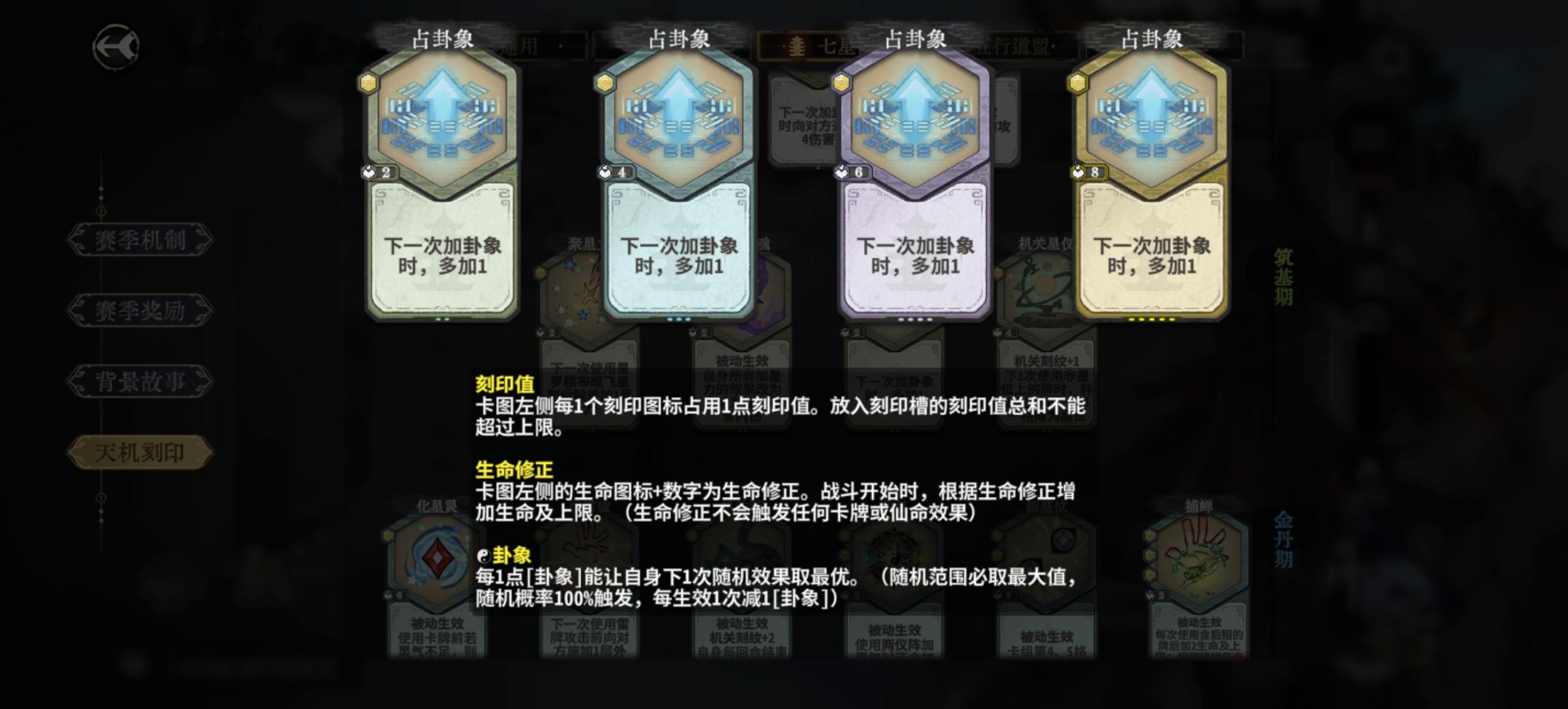 金丹:卖掉所有加卦卡,以及藕断这些打工牌,消耗牌只能留一张。上本前可以把卦盘位置空着提前把其他牌摆好。选择卦盘后摆上去。金丹期至少每轮一d吃概率加成,第五或第六轮也可以适当小d一下提升战力。另外注意卦盘不一定无脑一动,卦只要够用就行,可以一动星罗防御对位,或者先出落花+流水,地灵丹,四动再卦盘等。