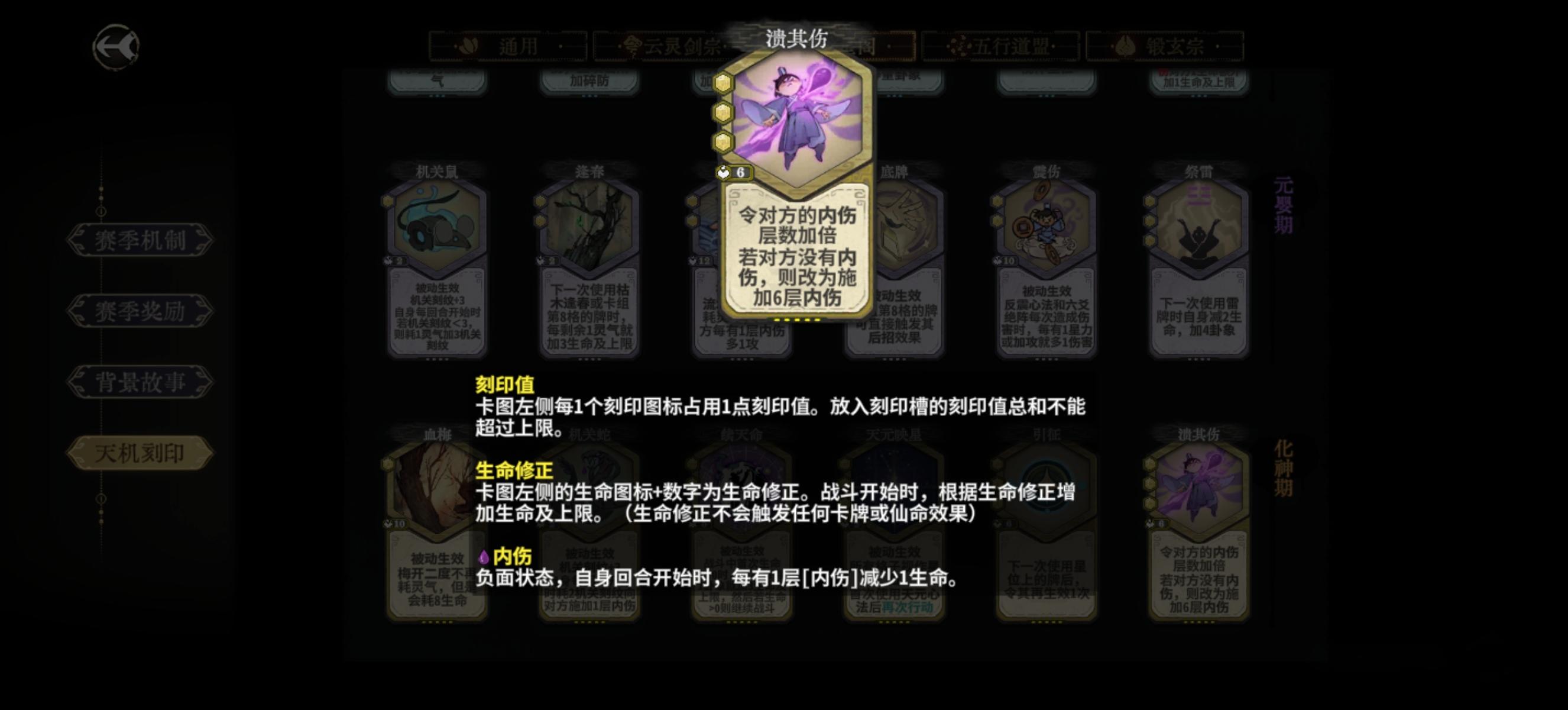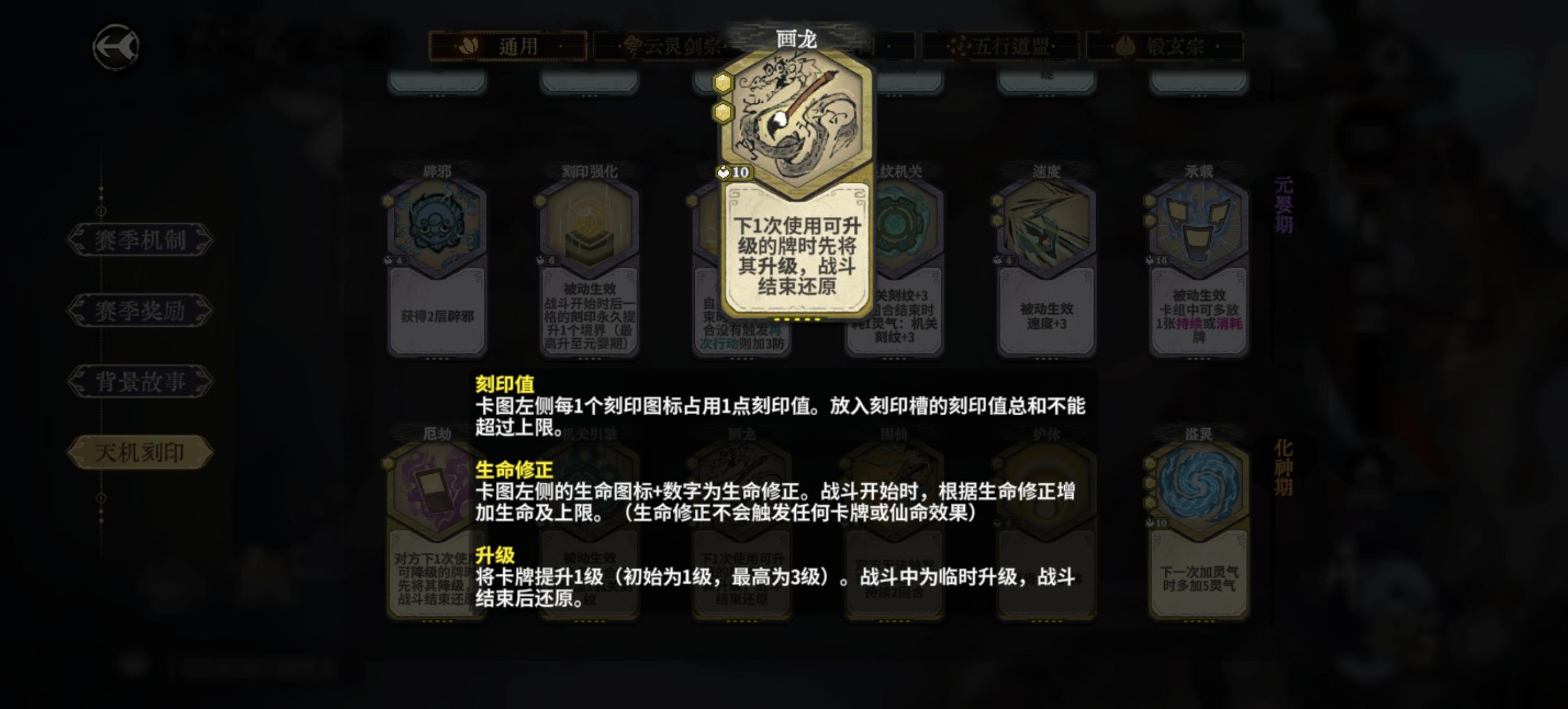 前期就是按数值去拿,标准模型是练气的一点刻印值4数值,每提升一个境界高2点。比如元婴的一个占一槽的刻印,数值要到10点才合格。