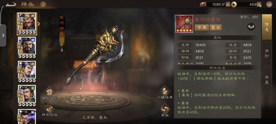 总结:专武以续航和抗性强化为主,未触及董卓“依赖队友叠负面”的核心痛点,属于“鸡肋”属性,1星解锁大招即可满足基础使用需求。