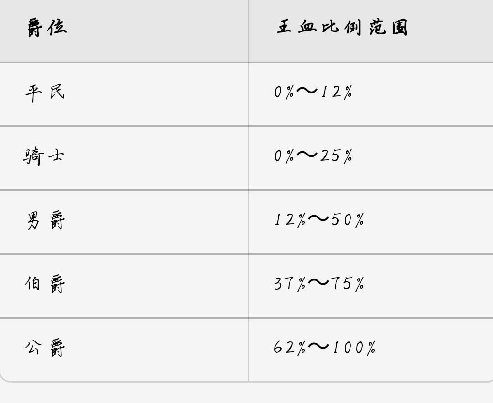 核心逻辑:后代爵位由父母爵位决定(如父母一个伯爵一个公爵,老大公爵老二伯爵,父母都是公爵老大老二都公爵),高爵位能快速接触到高纯度王血的联姻对象——公爵,伯爵阶层的配偶,血脉纯度往往远高于骑士、男爵。