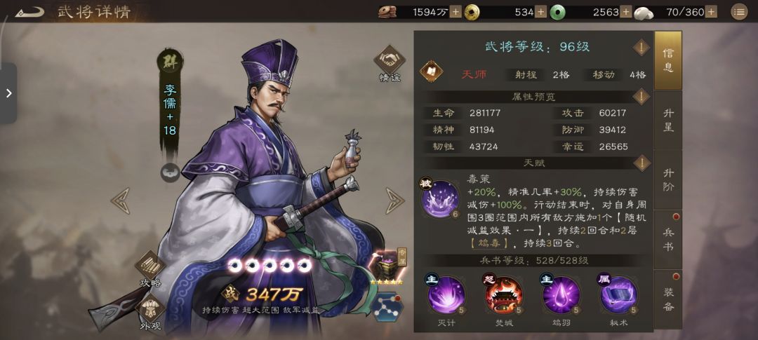 李儒的核心价值是破高减伤阵容,目前唯一刚需是奇策装备副本25层——这关大乔、鲁肃那边有1000%不可驱散的谋略减伤,只能靠他的“鸩毒”真伤打。其他场景里,PVE非刚需副本可当功能法师补减益和持续伤害;PVP里,对手没甄姬+貂蝉(强驱散组合)就好用,有就拉胯,属于对策卡。培养上不用刻意拉高星级,群雄玩家练起来当减益工具人。