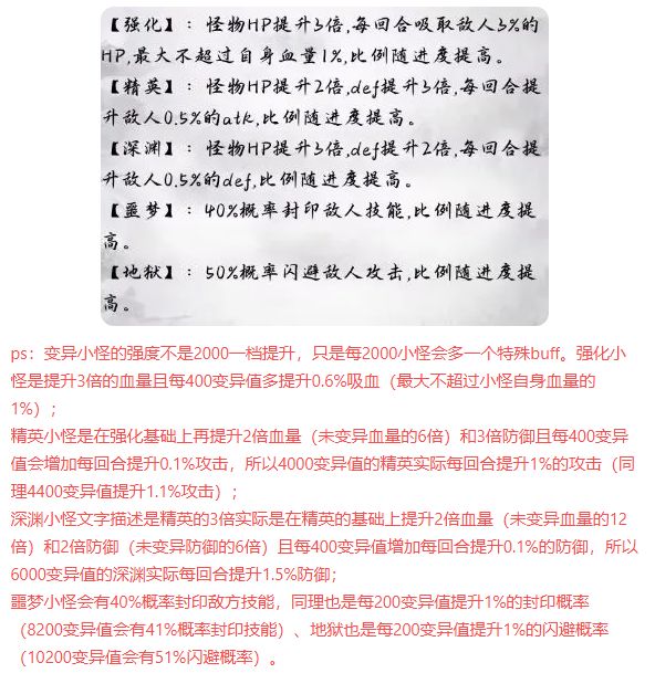 精英:小怪是在强化基础上再提升2倍血量(未变异血量的6倍)和3倍防御且每回合提升自身1%的防御,每400变异值提升0.1%的数值(4400变异值提升1.1%的防御)