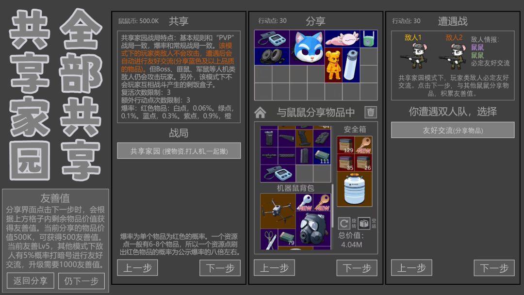 2、友善值:玩家可以和鼠鼠分享物品,或者拒收鼠鼠分享的物品来获得友善值。积累的友善值越多,友善等级越高,在其他战局中,遇到的敌人越可能打暗号。打暗号可以选择不接,选择不接就和原本的战斗一致。如果选择接暗号,就不会战斗,而是和鼠鼠分享物品。