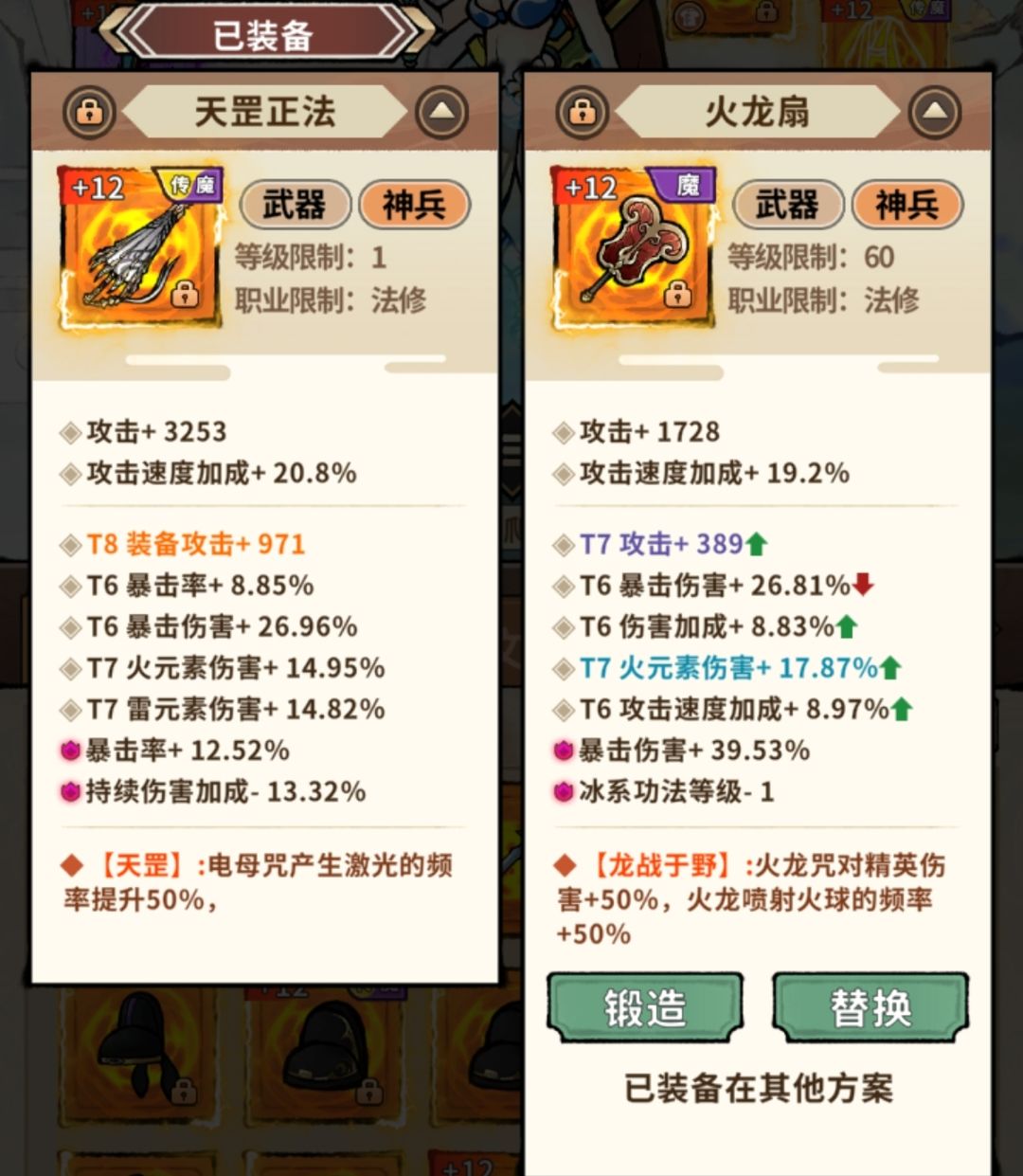 武器推荐:天罡正法、火龙扇,天罡为电母流派必带武器,没有之一!火龙扇则为火龙流派必带武器。以上武器均需t8装备攻击且优先强化。