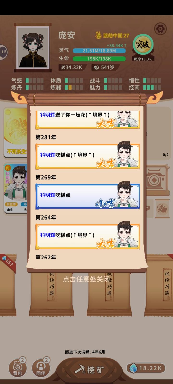 一个同伴成地仙了,我看这个人显示地仙再点了几下挖矿,就变成法剑飞我背包里了,看了一下日志,又提升了一个境界,应该是成天仙了。