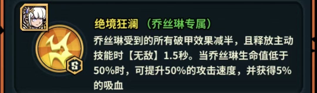 - 受到的破甲效果减半,这个属性让乔丝琳能够变的更肉更能抗!