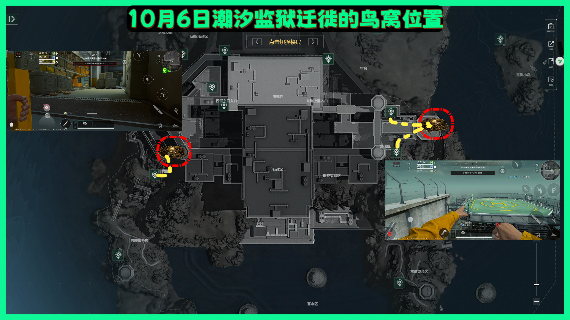 潮汐监狱一共有2个点位,依然全部都在室外,图片从左到右位置依次在:地图左下方的卸货区,水路左手边黄箱子上就是和地图最右边上方的直升机平台(非撤离点)上方位置,旁边就是出生点,手慢无,具体位置参考图片即可~