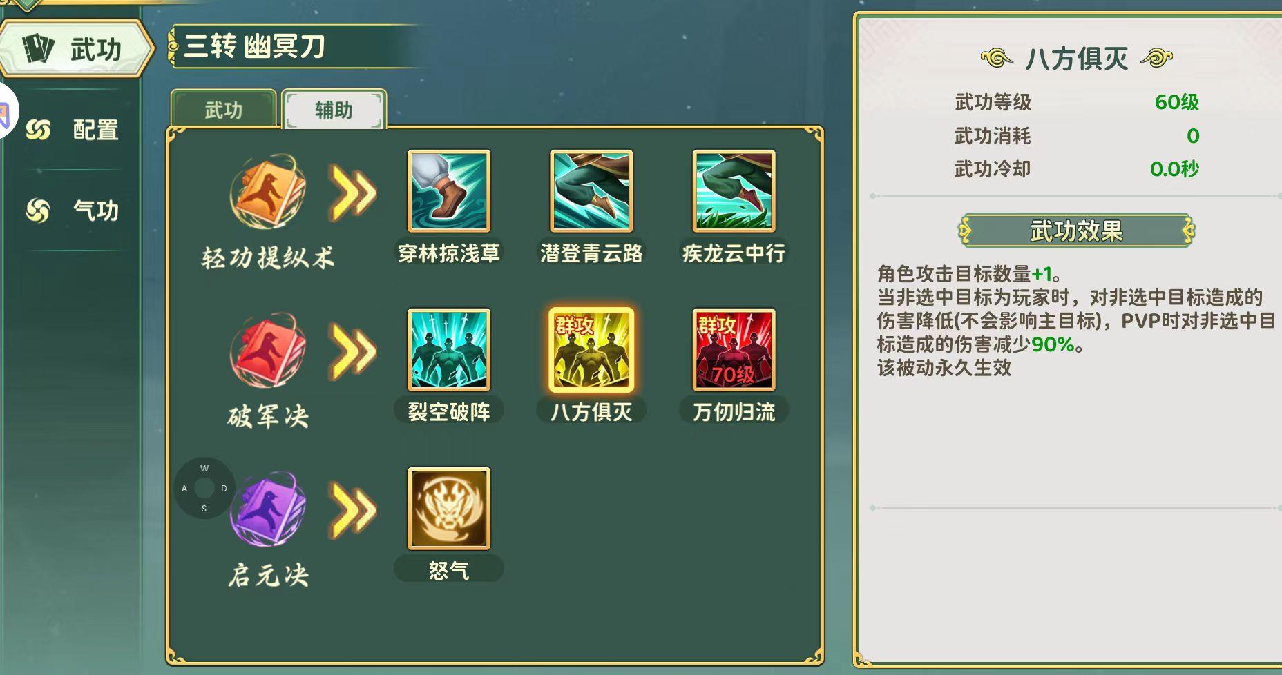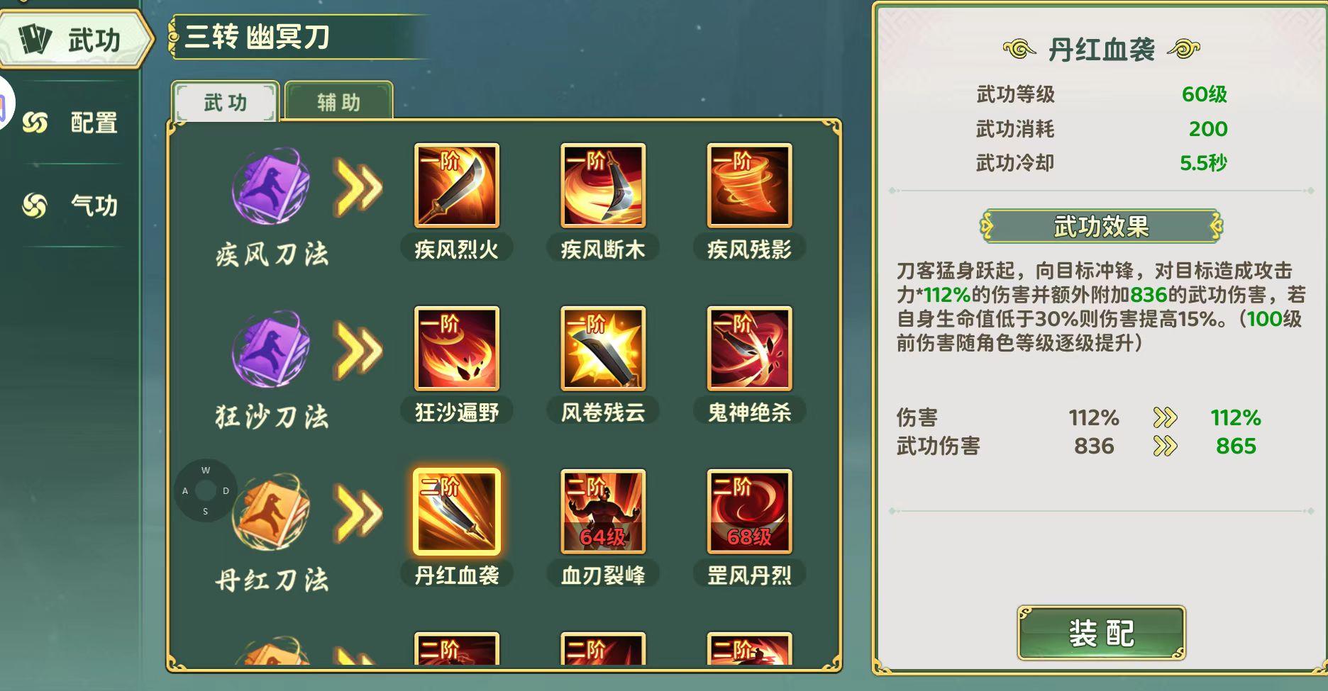 刀客三转的武功丹红血袭是一个非常强大的突进爆发技能,在PVP中非常好用,可以直取敌方后排辅助医师。包括辅助技能八方俱灭,可以让你的技能攻击对象加一,并且不会影响到武功的单体伤害,伤害非常爆炸。