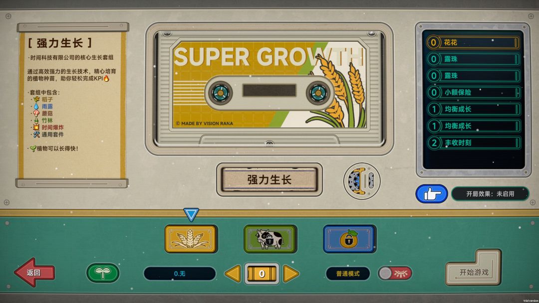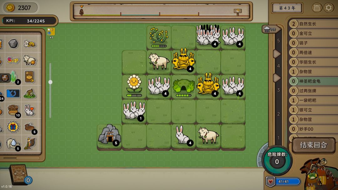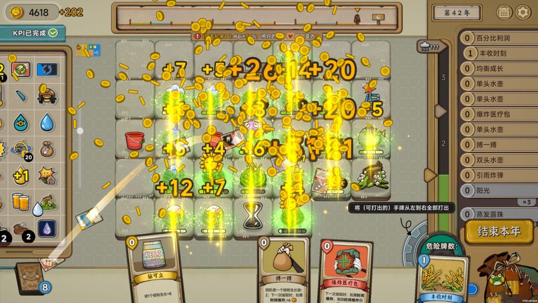在普通年或者大专年中,玩家需要利用手中的动植物来赚取金钱,每局都有不一样的金币要求,只有收成金币到达这个要求之后,才能通过下一关,提前完成的话就是给玩家赚钱。玩家最主要的目的还是攒钱,之后就能在商店或者随机事件中使用,用于购买更加强力的挂件以及法术、建筑卡牌或者动植物。