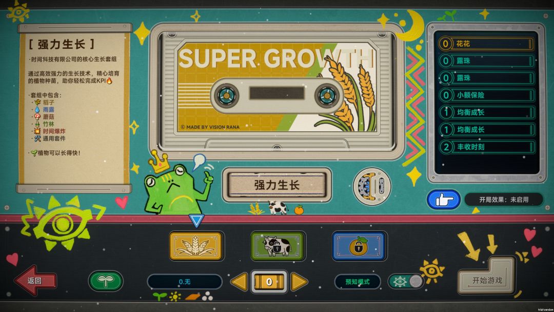《种呱得呱》是一款以赚钱为目标的卡牌策略游戏,玩家将扮演一位农场的管理员作为初来乍到的我们来说会变得很困难。推荐玩家还是休闲难度开局,先拿到一定的开局能力再说。而且游戏还有着不同的模式,特别是预知模式,可以知道下一次抽卡是否会发生爆炸,所以走植物卡组的爆炸流会很容易通关。玩家的目标也很简单,作为农场管理员,努力完成公司要求的收成金币目标,然后赚取更多金钱,挺过一个又一个的灾年,最后成长为一个经验老道的管理员。