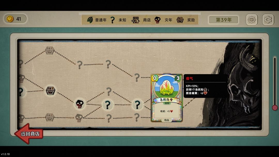 再说到关卡设计,初始玩家有四条路线可选,每条都会有不一样的事件,比如说普通年、灾年,宝箱、随机事件等等,当玩家到达一条路线时,会有共同点,然后就到了boss房,一共有三个大灾年(有强力的负面效果),全部通过之后就能通关,但是也有无尽模式供玩家挑战。值得一提的是,在游戏地图一开始就能查看到所有的大灾年类型,玩家可以提前做出预防。