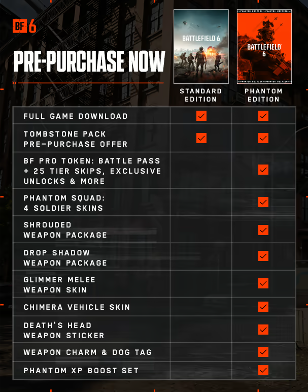 不管是预购标准版还是魅影版,都能拿到以下这些预购福利:“掘墓人” 士兵外观、“逝者荣光” 玩家卡、“弹药带” 武器饰物、“快递” 武器、专属贴纸、“战斧” L110 武器套件、“末日预言者” 士兵贴章,还有墓碑经验值强化套。