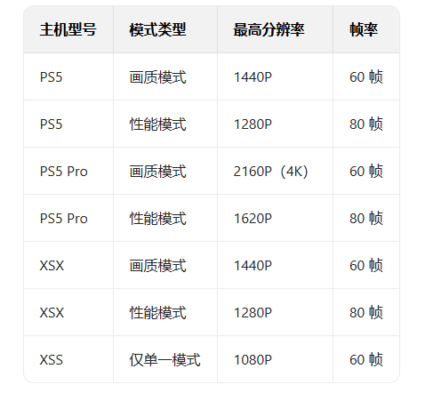- PS5:画质模式最高 1440P、60 帧,性能模式能到 1280P、80 帧;