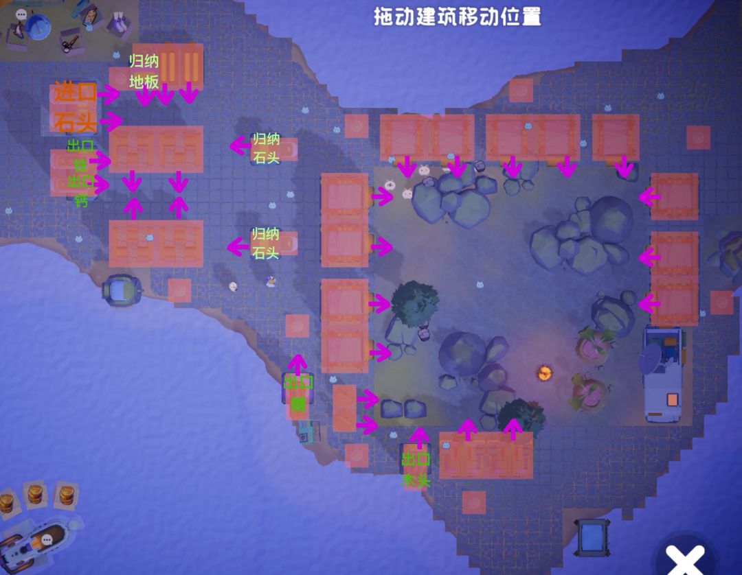 1,建筑有朝向,背包里面直接放置建筑,可以看到有个小箭头,就是建筑正面,蛋只会从建筑正面搬运东西(进出),所以这个很重要,图片中标紫色箭头为正面。