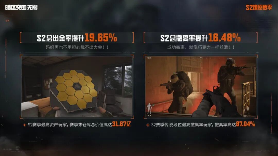 亲爱的先锋,暗区端游S3新赛季「破阵」已于9月16日正式开启。据可靠情报显示,在提升封锁、强化封锁模式中高价值物品的产出后,S2赛季全服总出金率提升19.65%;在放宽撤离条件、新增小队撤离点后,S2赛季全服总撤离率提升16.48%.