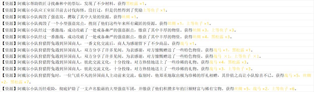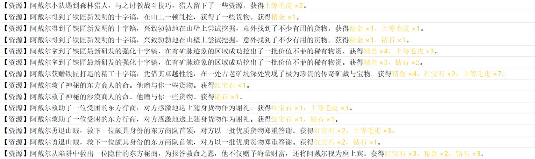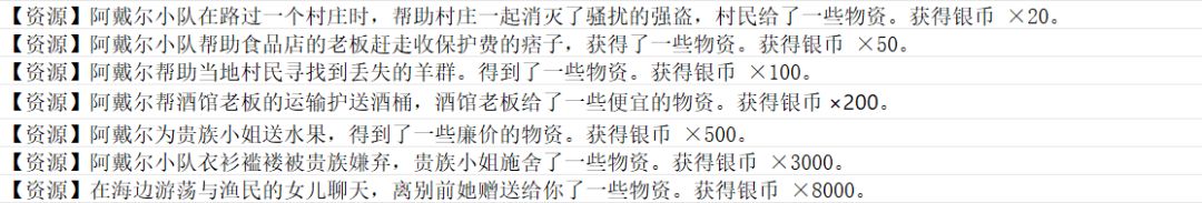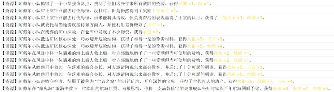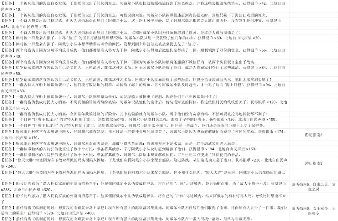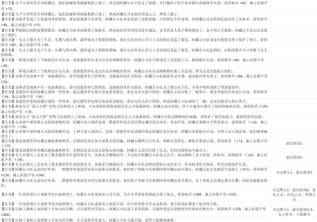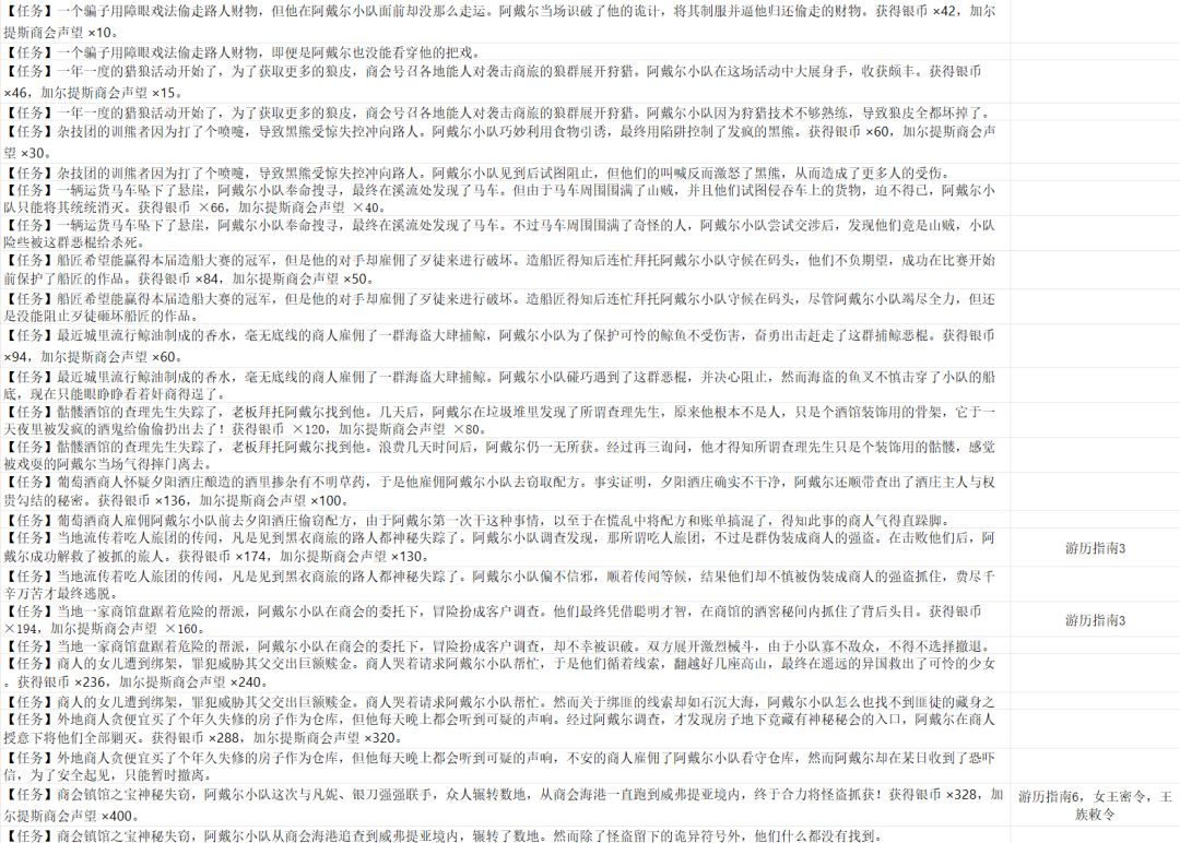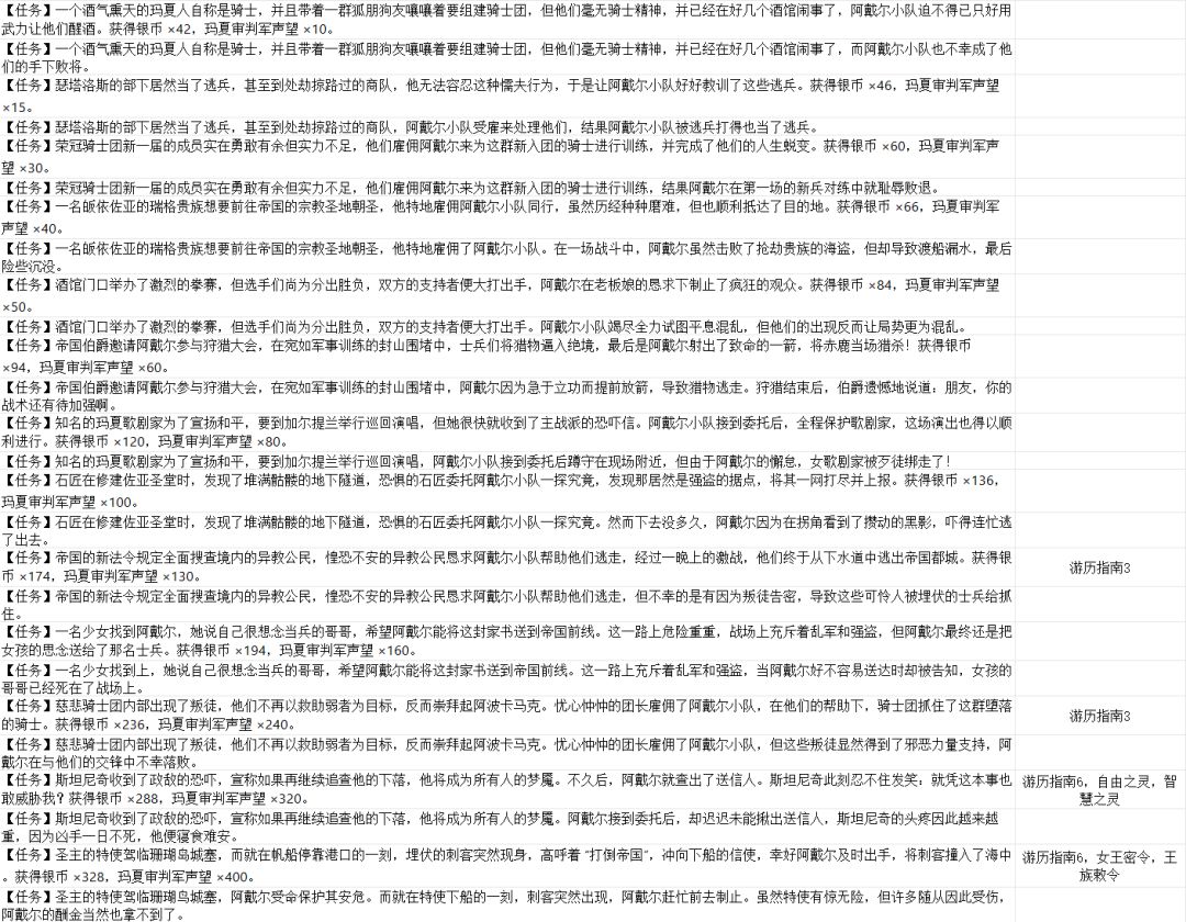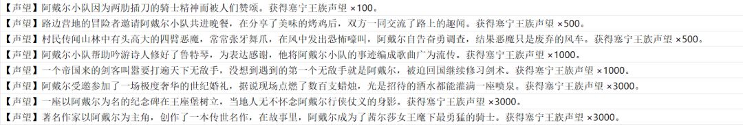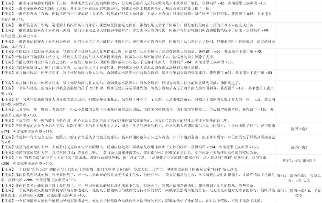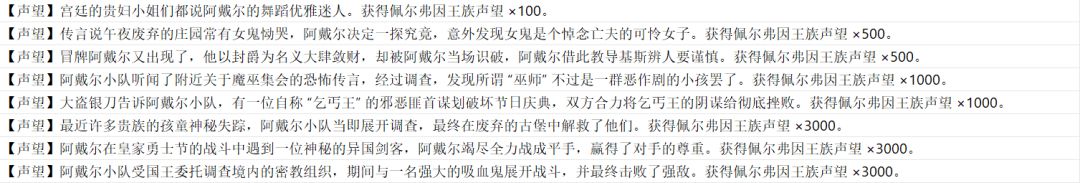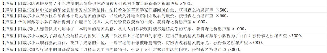 - 声望类:8条,具体为1条100声望 + 2条500声望 + 2条1000声望 + 3条3000声望。