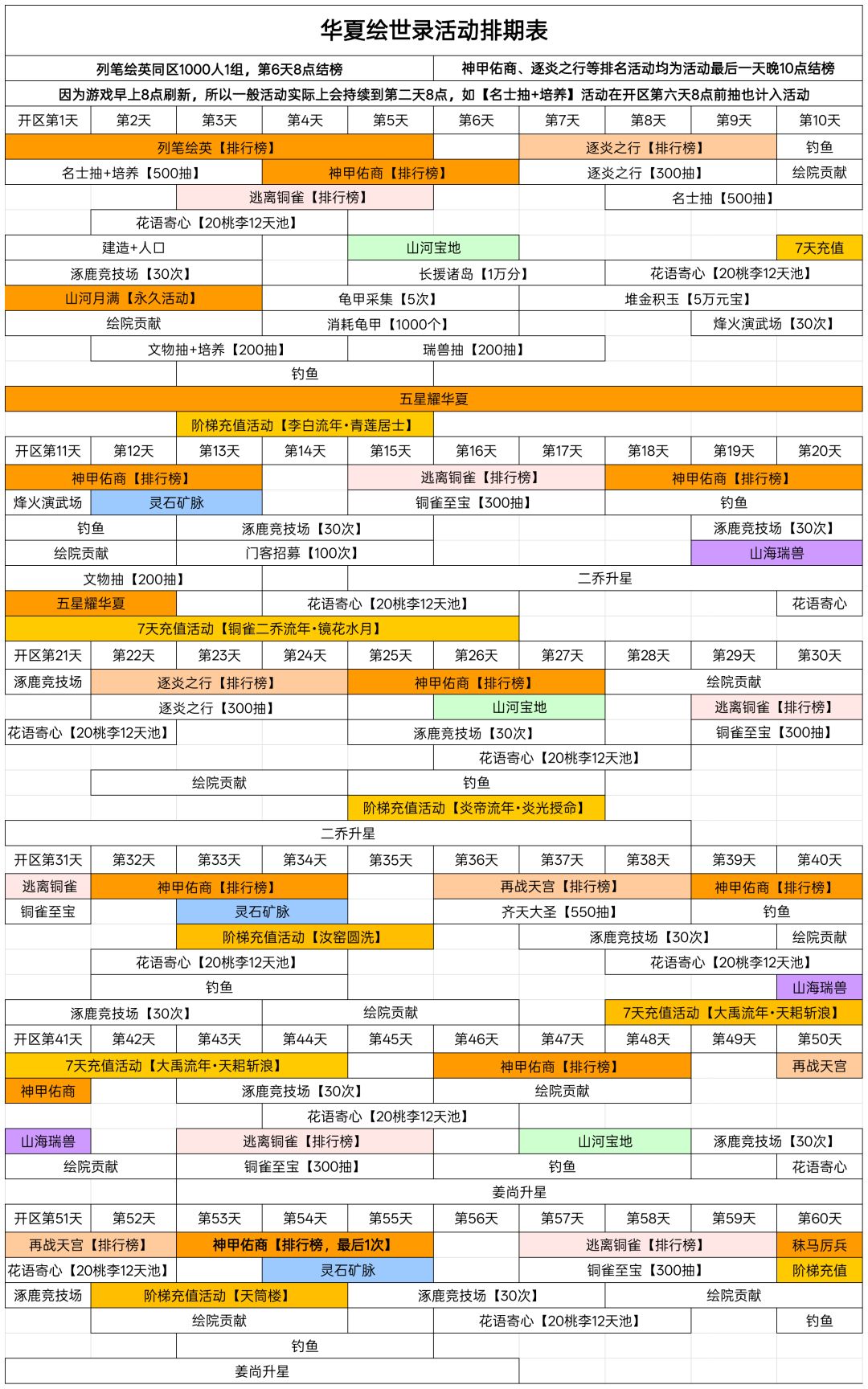 华夏绘世录除节日活动外,平时会有多个活动轮换,有些活动需要我们提前攒资源,有些活动需要注意结束时间。下面,我将给大家带来绘世录中的活动排期及简单介绍。
