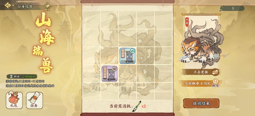 山海瑞兽开服第19日首次开启,此后21天一次。活动中共可白嫖33个山河笔,元宝购买可再得60个此活动不建议元宝购买,因为天品瑞兽碎片长援诸岛活动给的就足够用了。25个方格,后面点1个格子消耗的笔...
