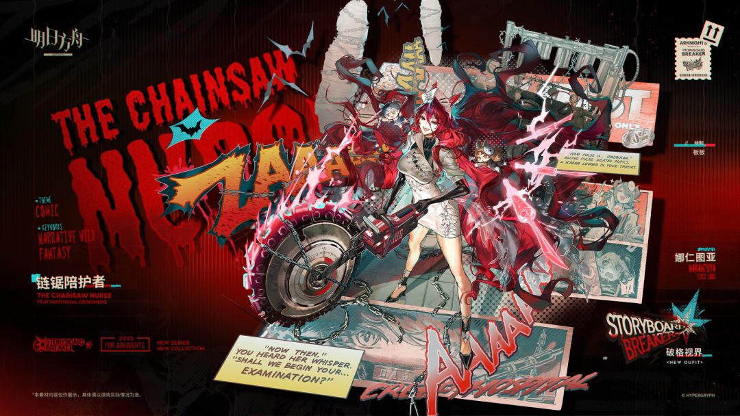 破格视界连载漫画《无从救赎》角色定稿/链锯陪护者。故事中恐怖医院护士的着装。巨大的链锯和显眼的缝合线,正是她身为第一个杰作永生至今的证明。