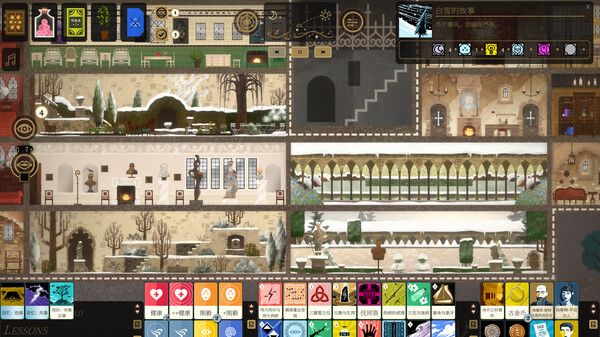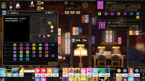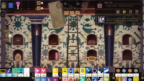 游戏本质上是对各种卡牌进行排列组合从而凑够所需相性才能进行下一步,而这就需要玩家了解卡牌有四种,分别是回忆与教诲、魂质、技能与语言、杂物,通过在交谈、书桌、工作台等地方,可以将他们排列组合在一起,能够进行开封书籍和雇佣帮手解锁房间等操作。