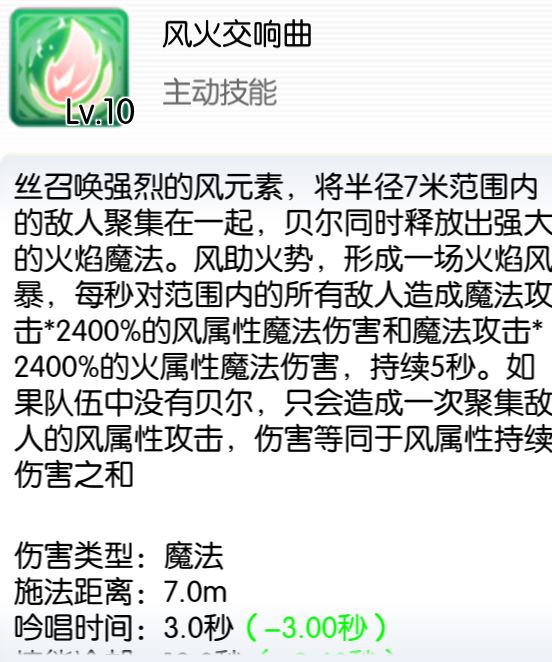 有个小特性,这个buff在有【贝尔】队友共处一地图情况下开启,给艾丝自己+60%魔伤加成以及60%风属性攻击以后,【贝尔】队友离开副本、离开地图或者退队,都不会令艾丝当前翻倍收益变回原来的30%魔伤以及30%风属性攻击,除非再次开启该buff重置buff时间。(tip:持续时间120s)