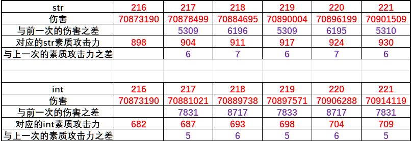 而下面的int【与前次伤害之差】我们可以看见不仅等数值点情况下,总是要高于str的【与前次伤害之差】,而且也不与int的【与上次素质攻击力之差】完全吻合,比如217int的【与前次伤害之差】为7831,令其*6/5=9397.2,比219int的8717大得多了,完全不契合素质攻击规律。