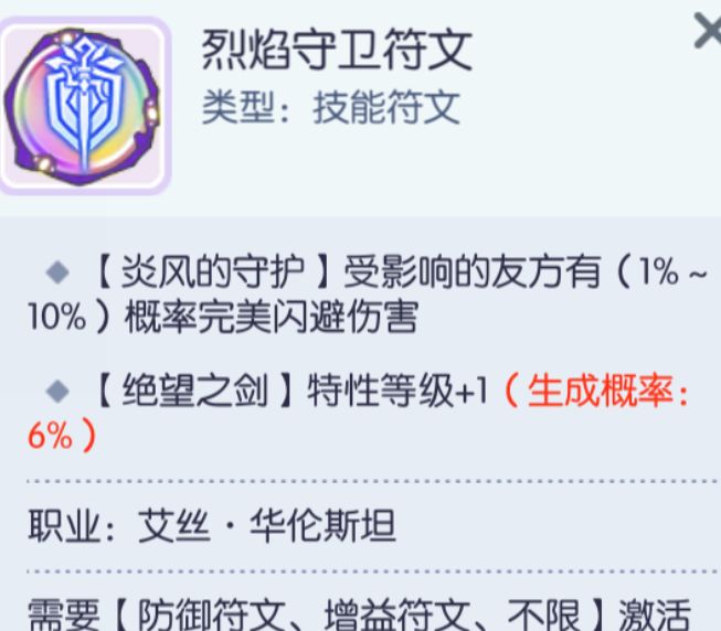 S符文【烈焰守卫】会使得【炎风的守护】额外给全队增加最高10%伤害闪避,意义不大。