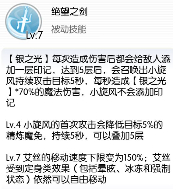 风灵疾走的持续时间内,艾丝半径5m内的敌人每秒都会受到一跳【银之光】的伤害(1440%基础倍率),也会叠加【绝望之剑】的层数,离开范围后不会像原始【银之光】那样跳剩下几次的伤害。