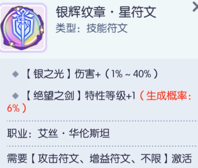 星符文【银辉纹章】:增加【银之光】最高40%独立增伤,以【银之光】为伤害基准的其他输出技能,当然计算中是正常享有受到符文增幅后的【银之光】伤害,核心输出符文,建议all in。