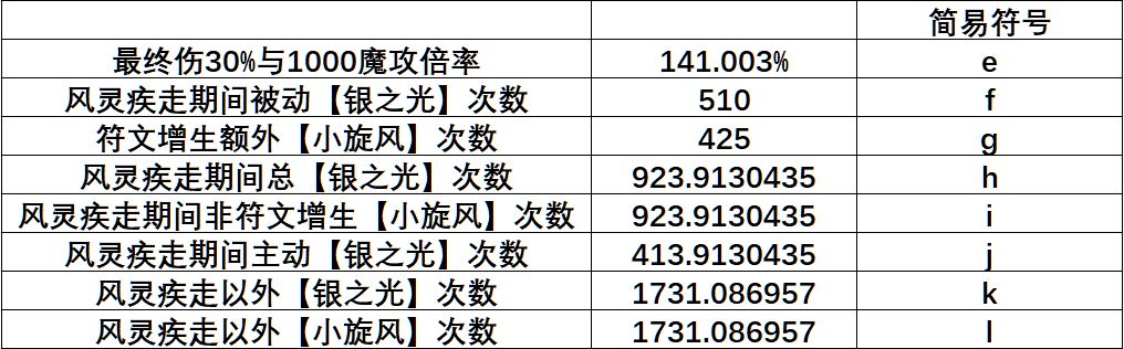 正常来说【银之光】与【小旋风】的跳数应该是基本一样的,表格里【小旋风】3080跳,【银之光】2655跳,3080-2655=425是星符文【风魂印记】其46%概率在【风灵疾走】期间所致的符文增生额外【小旋风】次数