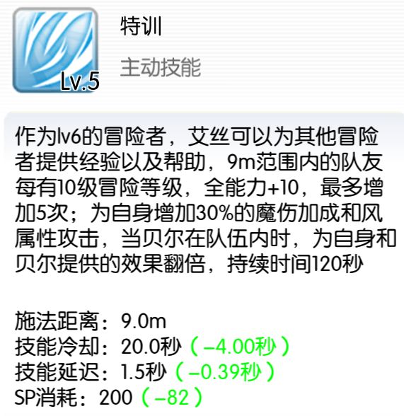 一个120s的群体buff,给有50级冒险等级的队友,全素质能力+50,给自己30%魔伤以及30%风属性攻击,队伍内有贝尔职业时,该buff将给贝尔+100全能力,给艾丝自己+60%魔伤加成以及60%风属性攻击,中规中矩的buff,常驻备战精英。
