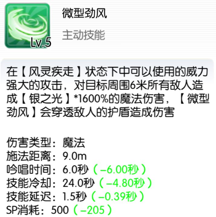 【微型劲风】是【风灵疾走】期间才可使用的长CD大范围高输出技能,可减少的24sCD,9m施法范围,半径6m的aoe,16跳【银之光】的倍率,即基础倍率为23040%,目前是游戏中数一数二的瞬时爆发技能了,不减少CD情况下一般【风灵疾走】期间只能用一次,减些CD再辅以跑路延长几秒【风灵疾走】则能够在此期间打出两发【微型劲风】。(利用传送娱乐玩法,可以打出3-4发)。