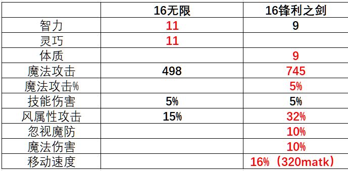 首先我们确定比较的对象是16【无限】和16【锋利之剑】,主要属性如下。