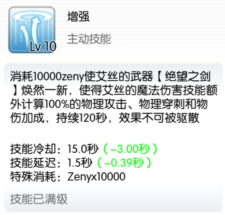 艾丝的最强主动buff,虽然每次要消耗10000zeny但还贴心给了个效果不可被驱散的效果,常驻备战精英的技能。