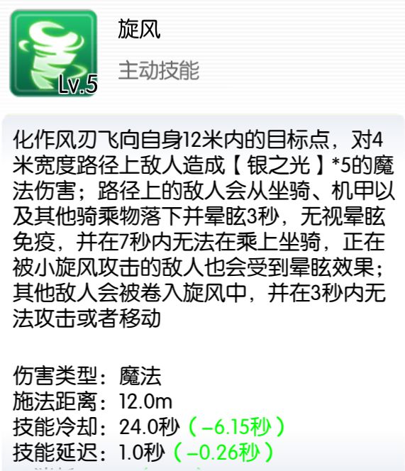 LV4以及以上情况下,每个小旋风的第一跳伤害会减少对方5%精炼魔免,最多叠加5层共计减少25%精炼魔免,持续5s,叠加新的精炼魔免削减会刷新持续时间。