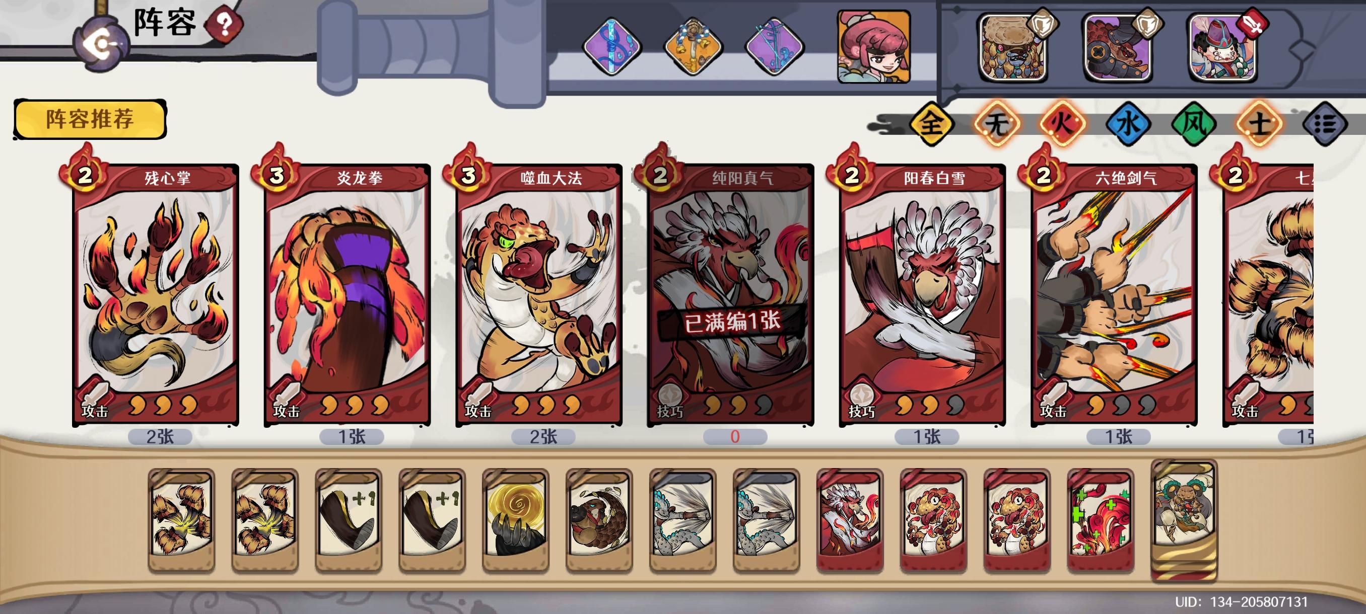 通背拳和神形百变用来触发行动嘲讽改变对面攻击意图对象,冲拳和血雾大法触发小丑自残,其他卡可自由搭配